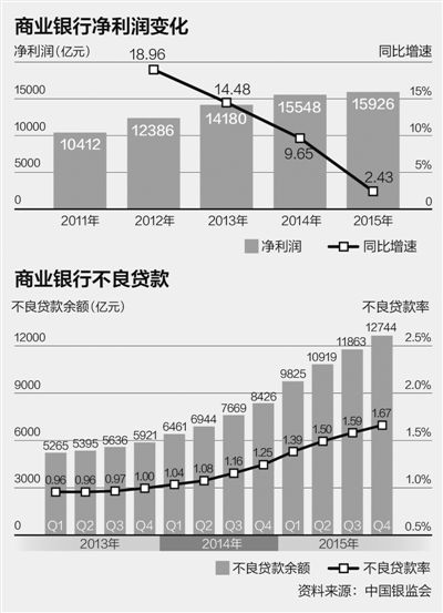 相比盈利狀況,銀行的資產(chǎn)質(zhì)量、不良貸款率水平的高低更受市場關(guān)注。銀監(jiān)會發(fā)布的數(shù)據(jù)顯示,2015年四季度末,商業(yè)銀行不良貸款余額增至1.27萬億元,較2014年增加4318億元,增幅達(dá)到51.25%;不良貸款率為1.67%,較2014年末上升0.42個百分點。