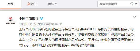 工商銀行進(jìn)一步解釋,停止該項(xiàng)業(yè)務(wù)和理財(cái)產(chǎn)品并無關(guān)聯(lián),該業(yè)務(wù)停止對(duì)資本市場(chǎng)無影響。