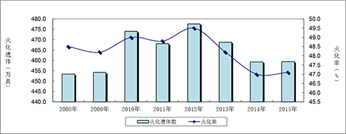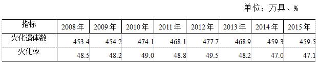 2.殯葬服務。截至2015年底,全國共有殯葬服務機構4530個,其中殯儀館1821個,殯葬管理機構1127個,民政部門管理的公墓1567個。殯葬服務機構職工共有8.4萬人,其中殯儀館職工4.7萬人。火化爐6063臺,火化遺體459.5萬具。火化率47.1%,比上年增加0.1個百分點。