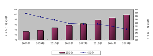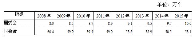 截至2015年底,基層群眾自治組織共計68.1萬個,其中:村委會58.1萬個,村民小組469.2萬個,村委會成員229.7萬人;居委會10萬個,比上年增長3.1%,居民小組134.7萬個,居委會成員51.2萬人,比上年增長3.0%。全年共有16.5萬個村(居)委會完成選舉,參與選舉的村(居)民登記數(shù)為2.1億人,參與投票人數(shù)為1.6億人。