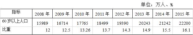 1.老齡服務。截至2015年底,全國60歲及以上老年人口22200萬人,占總人口的16.1%,其中65歲及以上人口14386萬人,占總人口的10.5%。全國共有老齡事業(yè)單位2280個,老年法律援助中心2.1萬個,老年維權協(xié)調(diào)組織7.1萬個,老年學校5.3萬個、在校學習人員732.8萬人,各類老年活動室37.1萬個;享受高齡補貼的老年人2155.1萬人,享受護理補貼的老年人26.5萬人,享受養(yǎng)老服務補貼的老年人257.9萬人。