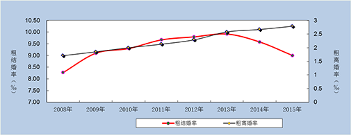 1.婚姻登記服務。2015年全國共有事業(yè)單位性質的婚姻登記機構2064個,辦理婚姻登記事務的處數(shù)5714處。各級民政部門和婚姻登記機構共依法辦理結婚登記1224.7萬對,比上年下降6.3%。其中:涉外及華僑、港澳臺居民登記結婚4.1萬對。粗結婚率為9.0‰。2015年25-29歲辦理結婚登記占結婚總人口比重最多,占39.4%,比上年增加1.4個百分點。