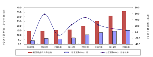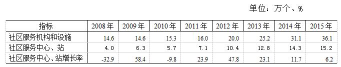 8.社區(qū)服務。截至2015年底,全國共有各類社區(qū)服務機構和設施36.1萬個,覆蓋率52.9%,其中,社區(qū)服務指導中心863個,社區(qū)服務中心2.4萬個,比上年增長4.3%,社區(qū)服務站12.8萬個,比上年增長6.7%,社區(qū)養(yǎng)老服務機構和設施2.6萬個,比上年增長36.8%,互助型的養(yǎng)老設施6.2萬個,比上年增長55%,其他社區(qū)服務設施12.0萬個,比上年增長12.1%。城鎮(zhèn)便民、利民服務網(wǎng)點24.9萬個。社區(qū)志愿服務組織9.6萬個。