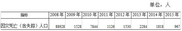 5.防災減災。2015年全國各類自然災害共造成1.9億人次不同程度受災,因災死亡失蹤967人,緊急轉移安置644.4萬人次;農(nóng)作物受災面積21769.8千公頃,其中絕收面積2232.7千公頃;倒塌房屋24.8萬間,損壞房屋250.5萬間;因災直接經(jīng)濟損失2704.1億元。國家減災委、民政部共啟動20次國家救災應急響應,累計救助受災群眾6000余萬人次,向受災省份累計下?lián)苤醒胱匀粸暮ι钛a助資金94.72億元,緊急調(diào)撥4.7萬頂救災帳篷、16.1萬床棉被、11萬件棉大衣、2.3萬個睡袋、5萬張折疊床等生活類中央救災物資,高效有序應對了波及我國西藏日喀則地區(qū)的尼泊爾強烈地震、云南滄源地震、新疆皮山地震、臺風“蘇迪羅”和“彩虹”、南方暴雨洪澇風雹災害等重特大自然災害。創(chuàng)建“全國綜合減災示范社區(qū)”1390個。
