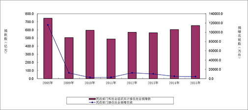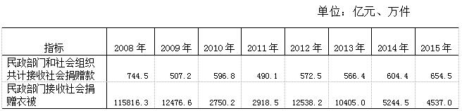 慈善捐贈。截至2015年底,全國共建立經(jīng)常性社會捐助工作站、點和慈善超市3.0萬個(其中:慈善超市9654個)。全年共接收社會捐贈款654.5億元,其中:民政部門直接接收社會各界捐款44.2億元,各類社會組織接收捐款610.3億元。全年各地民政部門接收捐贈衣被4537.0萬件,捐贈物資價值折合人民幣5.2億元。間接接收其他部門轉入的社會捐款4.3億元,衣被172.5萬件,捐贈物資折款6164.4萬元。全年有1838.4萬人次困難群眾受益。全年有934.6萬人次在社會服務領域提供了2700.7萬小時的志愿服務。
