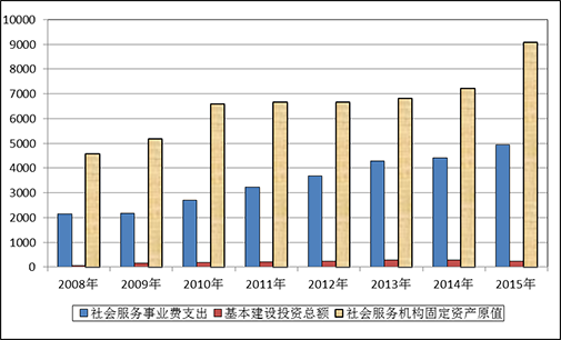 截至2015年底,全國共有社會服務機構和設施176.5萬個,比上年增長5.8%;職工總數(shù)1308.9萬人,比上年增長4.6%(全國持證社會工作者共計20.6萬人,比上年增長28.8%,其中社會工作師5.2萬人,助理工作師15.4萬人);固定資產(chǎn)總價9099.0億元,比上年增長26.1%;社會服務事業(yè)基本建設在建項目建設規(guī)模4087.3萬平方米,全年實際完成投資總額239.9億元;全國社會服務事業(yè)費支出4926.4億元,比上年增長11.9%,占國家財政支出比重為2.8%,其中中央財政向各地轉移支付社會服務事業(yè)費2270.3億元,比上年增長8.4%,占社會服務事業(yè)費比重為46.1%,下降了1.7個百分點。