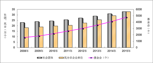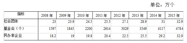 1.社會組織。截至2015年底,全國共有社會組織66.2萬個,比上年增長9.2%;吸納社會各類人員就業(yè)734.8萬人,比上年增長7.7%;全年累計收入2929.0億元,支出2383.8億元,形成固定資產(chǎn)2311.1億元。接收各類社會捐贈610.3億元。全年共查處社會組織違法違規(guī)案件2951起,其中取締非法社會組織23起,行政處罰2928起。