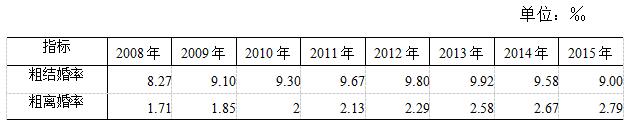 2015年依法辦理離婚手續(xù)的共有384.1萬對,比上年增長5.6%,其中:民政部門登記離婚314.9萬對,法院辦理離婚69.3萬對。粗離婚率為2.8‰,比上年增加0.1個千分點。