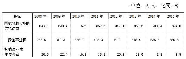 2015年全年累計資助優(yōu)撫對象436.5萬人次,優(yōu)撫醫(yī)療補助資金34.6億元,人均補助水平793元。