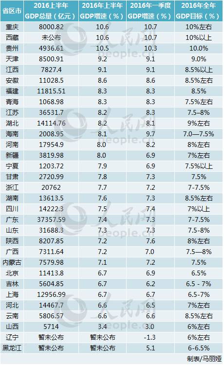 人民網(wǎng)北京8月2日電 (記者馬麗婭、劉甜甜、劉政寧)7月中下旬,在國家統(tǒng)計(jì)局公布上半年6.7%的經(jīng)濟(jì)增速數(shù)據(jù)后,各省區(qū)市上半年的經(jīng)濟(jì)表現(xiàn)也陸續(xù)揭開面紗。截至發(fā)稿時(shí),除黑龍江、遼寧2地未公布外,全國29省區(qū)市已公布GDP數(shù)據(jù),重慶和西藏繼一季度后繼續(xù)以10.6%的成績領(lǐng)跑。