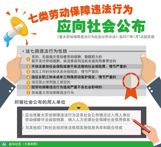新華社北京9月12日電(記者徐博)《重大勞動(dòng)保障違法行為社會(huì)公布辦法》自2017年1月1日起實(shí)施。人力資源和社會(huì)保障部勞動(dòng)監(jiān)察局相關(guān)負(fù)責(zé)人12日說(shuō),七類重大勞動(dòng)保障違法行為應(yīng)當(dāng)向社會(huì)公布。