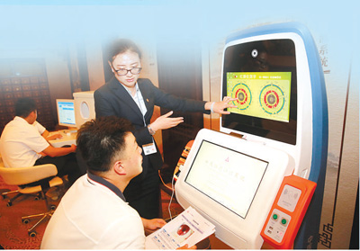 7月6日,金磚國(guó)家衛(wèi)生部長(zhǎng)會(huì)暨傳統(tǒng)醫(yī)藥高級(jí)別會(huì)議在天津召開(kāi),參會(huì)人員體驗(yàn)中醫(yī)綜合檢測(cè)系統(tǒng)。