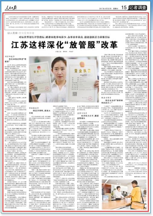 人民日報:江蘇"放管服"改革讓政府做好"店小二"