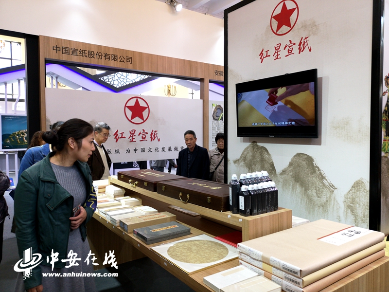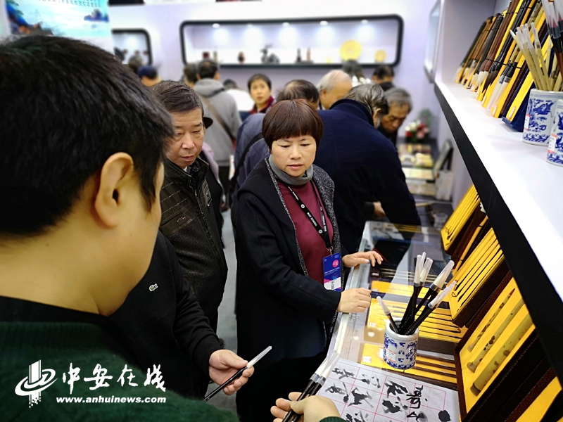 黃山展廳展出了“文房四寶”中的筆、墨、硯,而著名的宣紙就在隔壁的宣城展廳。一進(jìn)宣城展廳記者就看到宣紙展臺(tái)前圍滿(mǎn)了參觀者,“我的名片都不夠用。”工作人員告訴記者,前來(lái)參觀、索要名片、添加微信的人絡(luò)繹不絕,潔白的宣紙儼然是展廳的主角。“我對(duì)安徽文化有一定的了解。”前來(lái)宣城展廳參觀的徐先生告訴記者,自己對(duì)宣紙一直沒(méi)有抵抗力,“每次看到宣紙就有想要購(gòu)買(mǎi)的欲望。”這次也不例外,離開(kāi)展廳時(shí),徐先生帶了厚厚的幾本宣紙。