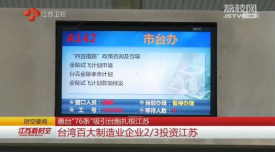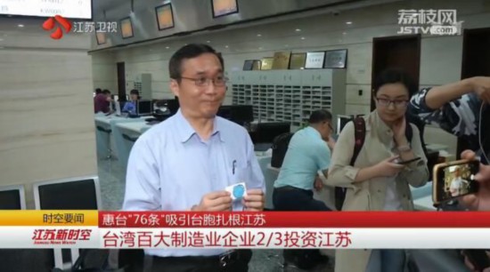 去年9月江蘇出臺(tái)惠臺(tái)"76條"新政以來,越來越多在江蘇就業(yè)和生活的臺(tái)胞享受到與江蘇居民同等的待遇,吸引更多臺(tái)商來蘇投資,臺(tái)灣百大制造業(yè)企業(yè)超過三分之二投資江蘇。