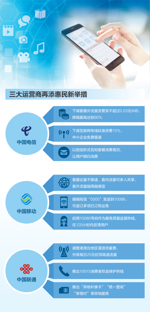 一是深挖降費(fèi)潛力。近年來,已先后實施“套餐內(nèi)當(dāng)月流量不清零”、取消手機(jī)國內(nèi)長途和漫游費(fèi)以及流量“漫游”費(fèi)等措施,今年將進(jìn)一步降低移動流量資費(fèi)和企業(yè)專線資費(fèi)。