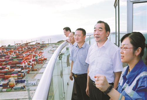 市委書記周鐵根率團(tuán)考察中國(guó)(上海)自由貿(mào)易試驗(yàn)區(qū)臨港新片區(qū)上港集團(tuán)洋山四期自動(dòng)化碼頭。 徐州日?qǐng)?bào)全媒體記者 徐劍 攝