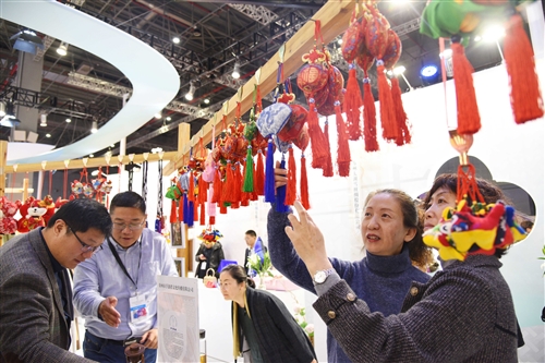 在江蘇省創(chuàng)意生活區(qū),徐州市手創(chuàng)者文化傳播有限公司向過往嘉賓和群眾展示了徐州香包、手繪臉譜、魚皮畫等非遺產(chǎn)品,并向他們介紹起了每件寓意和功效,受到了大家的追捧。