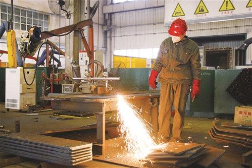 華東機(jī)械公司職工對(duì)板材進(jìn)行切割下料。