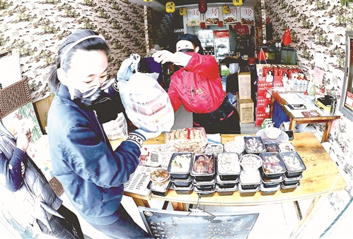 圖⑤ 一家飯店,服務員把打包好的食品遞給顧客帶走,我市眾多飯店主打外賣業(yè)務,豐富市民餐桌。