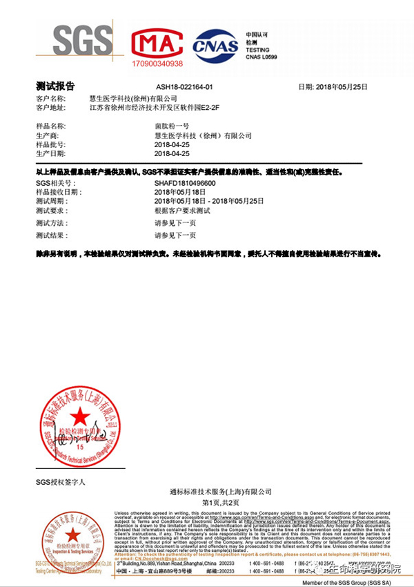 5月28號(hào),徐州慧生醫(yī)學(xué)研發(fā)的菌肽粉Ⅰ號(hào)、水蘇糖獼猴桃海藻沖劑兩項(xiàng)成果,順利通過(guò)國(guó)際SGS檢測(cè),各項(xiàng)指標(biāo)全部符合國(guó)際標(biāo)準(zhǔn)要求;標(biāo)志著這兩款填補(bǔ)了國(guó)際空白的科技成果,得到了國(guó)際專業(yè)機(jī)構(gòu)的鑒定,使得該產(chǎn)品能夠順利進(jìn)入世界所有國(guó)家和地區(qū),形成了真正走向世界的民族品牌。