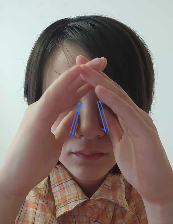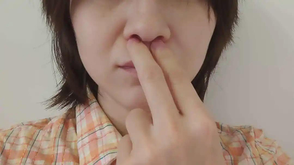 將右手食指、中指放于兩鼻孔處,點(diǎn)按鼻中隔與鼻翼之間,點(diǎn)按時(shí)稍用力,每次點(diǎn)按50~100次。