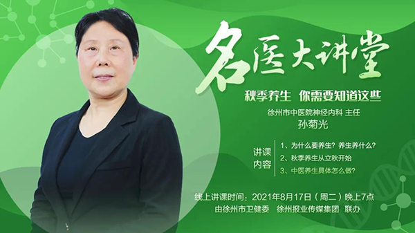 8月17日(周二)晚上7:00,由徐州市衛(wèi)生與健康委員會和徐州報業(yè)傳媒集團主辦,徐州報業(yè)傳媒集團健康醫(yī)療中心承辦的《名醫(yī)大講堂》通過漢風號APP進行直播,本期邀請到徐州市中醫(yī)院神經(jīng)內(nèi)科主任、醫(yī)學博士孫菊光教授,請她為大家就“秋季養(yǎng)生”展開主題講座。
