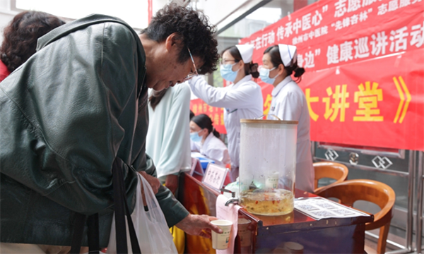 講解結(jié)束后,現(xiàn)場迎來了備受期待的中醫(yī)養(yǎng)生實踐體驗環(huán)節(jié)。中醫(yī)護理治療師們?yōu)榇蠹已菔玖酥嗅t(yī)耳穴壓豆和刮痧的操作方法,展示了中醫(yī)藥的魅力。參與者們熱情高漲,紛紛爭相體驗傳統(tǒng)中醫(yī)的博大精深。此外,徐州市中醫(yī)院還精心準(zhǔn)備了中藥茶飲供大家品嘗,體會中醫(yī)藥在食療保健方面的卓越功效。