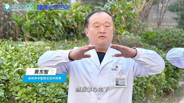 兩掌在頭頂上方稍作停頓后,兩臂外旋,兩掌分別向身體兩側(cè)下落,掌心向外,指尖向下。