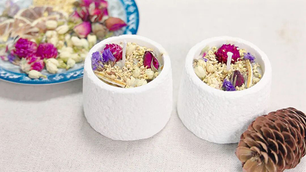 定型裝飾 待蠟液溫度降至55℃左右時,加入中藥粗粉,輕輕攪拌(避免產(chǎn)生過多氣泡);用鑷子將蠟芯固定在蠟燭模具中心,緩慢倒入蠟液;室溫靜置至蠟液完全凝固后,在蠟燭表面撒上陳皮絲、丁香粒、干燥薄荷葉做裝飾,中藥香薰蠟燭即制作完成。