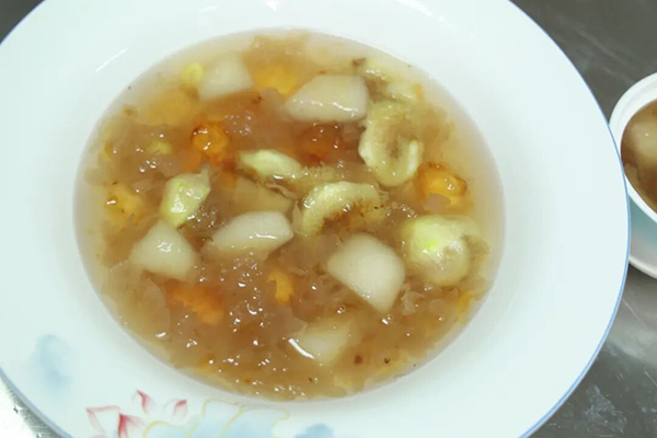 將銀耳、桃膠放入燉鍋中,加入適量清水大火煮開后轉(zhuǎn)小火慢燉一小時,加入雪梨塊、無花果、銀杏,繼續(xù)小火燉煮30分鐘。最后加入冰糖、桂花醬即可。