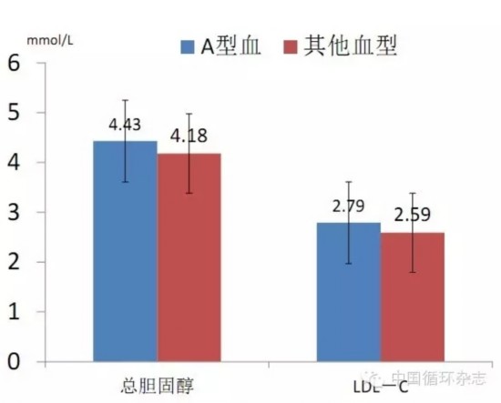 在898例疑診冠心病并進(jìn)行選擇性冠脈造影檢查的患者中,A型血患者冠心病的檢出率達(dá)57.1%,顯著高于非A型血組的47.3%。此外,A型血受試者的血脂狀況更不理想。(如圖)