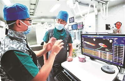 他一邊盯住視頻監(jiān)控,一邊將極細(xì)的導(dǎo)絲穿刺進(jìn)患者大腿股靜脈,沿著血管慢慢深入到心臟左心房肺靜脈部位,然后啟動導(dǎo)絲的消融電極,在病灶處一點點消融。