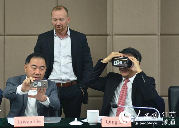 江蘇省產(chǎn)研院執(zhí)行院長劉慶現(xiàn)場體驗(yàn)VR眼鏡。江蘇產(chǎn)研院宣曉慶 攝