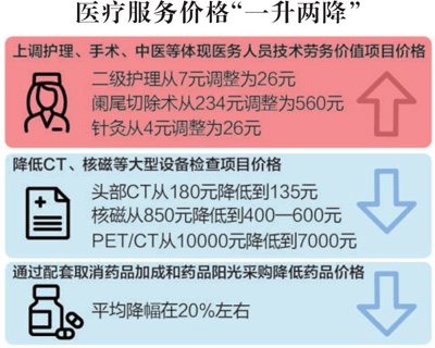 北京啟動(dòng)醫(yī)藥分開綜合改革,取消掛號費(fèi)、診療費(fèi),取消藥品加成,設(shè)立醫(yī)事服務(wù)費(fèi),435項(xiàng)醫(yī)療服務(wù)價(jià)格將規(guī)范調(diào)整。此次價(jià)格調(diào)整具體為“一升兩降”,重點(diǎn)提高了床位、護(hù)理、注射、中醫(yī)、手術(shù)等項(xiàng)目價(jià)格,降低了CT、核磁等大型儀器設(shè)備檢查項(xiàng)目價(jià)格。改革后全市醫(yī)療費(fèi)用總量上基本平衡,患者費(fèi)用負(fù)擔(dān)總體沒有增加。