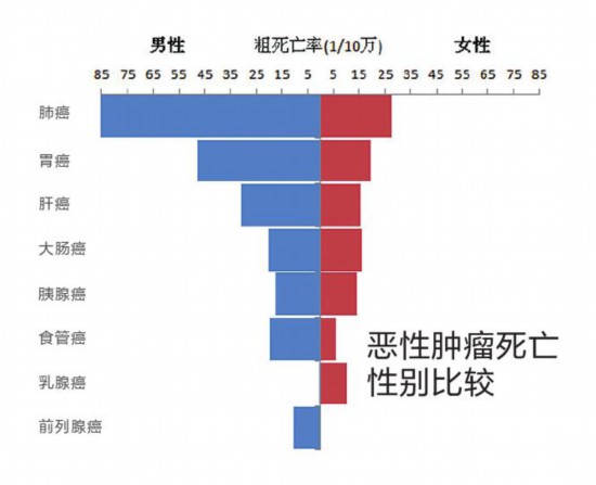 去年共發(fā)生惡性腫瘤死亡14625例,平均每天因惡性腫瘤死亡40人。前五位分別是肺癌(26%)、胃癌(16%)、肝癌(11%)、大腸癌(8%)、胰腺癌(7%),前五位惡性腫瘤占所有惡性腫瘤死因的68%。