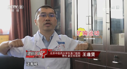 王逢賢說:“平常我們有一些非常簡單的動作,隨時隨地都可以做,就可以達到很好的鍛煉目的。比如說擴胸運動,還有聳肩的動作,深吸一口氣,把肩聳起來然后慢慢放下去,還有頭手相抗,兩手交叉,放在我們的后枕部頭向后仰,雙手向前對抗,這些動作做完之后,都會感覺到非常舒服。”