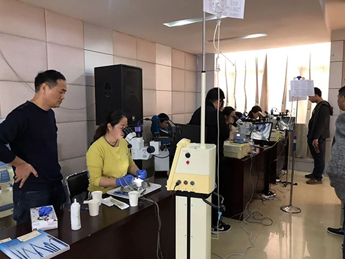 學(xué)習(xí)班突出重視臨床實(shí)踐的目的,每年都安排白內(nèi)障Wet-lab超聲乳化技術(shù)培訓(xùn),今年安排了六臺(tái)超聲乳化機(jī)和顯微鏡,顯微鏡配有屏幕,方便老師的帶教,同時(shí)提供了非常充足的耗材,供學(xué)員練習(xí)。