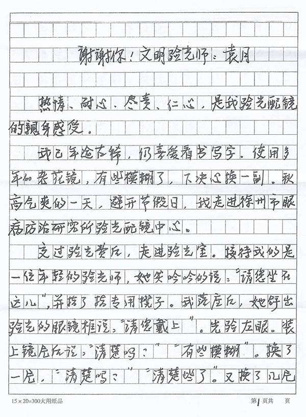 近日,徐州市第一人民醫(yī)院·眼防所驗(yàn)光配鏡中心收到了一位顧客送來(lái)的親筆感謝信,顧客在信中表達(dá)了對(duì)市一院驗(yàn)光師袁月的感激之情。