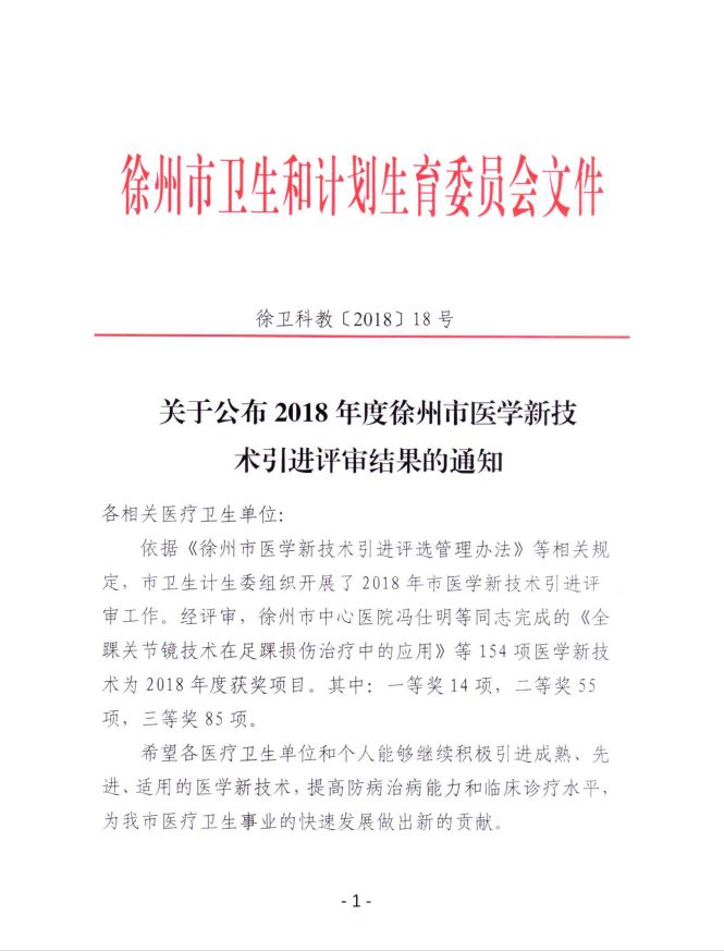 根據(jù)市衛(wèi)生計生委《關(guān)于公布2018年度徐州市醫(yī)學(xué)新技術(shù)引進評審結(jié)果的通知》(徐衛(wèi)科教〔2018〕18號),徐州市第一人民醫(yī)院2018年獲得11項徐州市醫(yī)學(xué)新技術(shù)引進獎,獲獎總數(shù)位居徐州市衛(wèi)生計生委屬單位第二名。