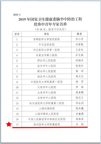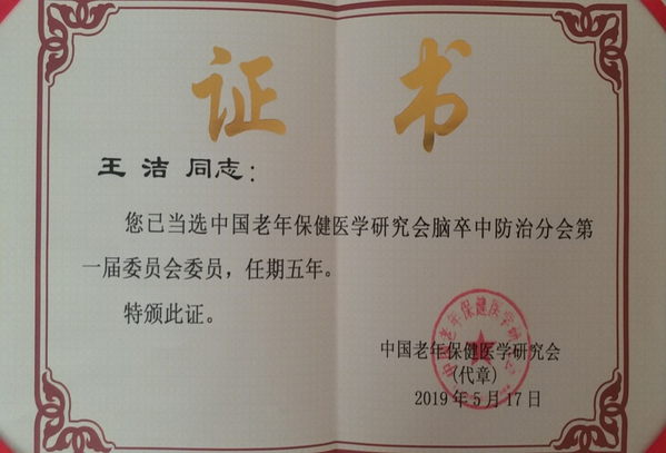 神經(jīng)內(nèi)科耿德勤教授還被授予中國卒中中心管理指導委員會督查專家,醫(yī)務處王潔副處長當選中國老年保健醫(yī)學會腦卒中防治分會第一屆委員會委員,神經(jīng)內(nèi)科許剛授予2019年國家健康委腦卒中防治工程優(yōu)秀中青年專家。