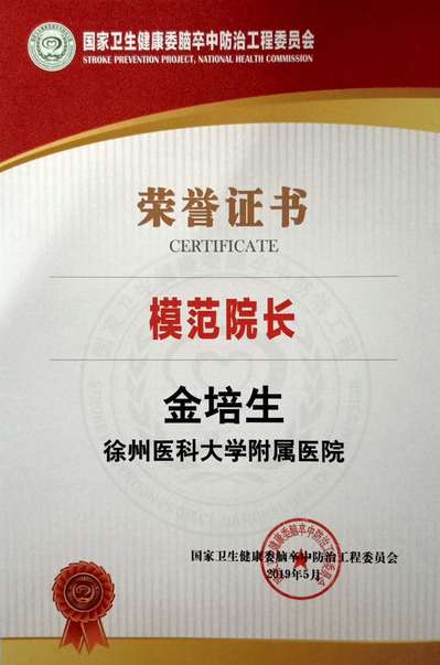 為表彰在腦卒中防治工作中勇于擔當、敢作敢為的優(yōu)秀院長,鼓勵推動醫(yī)療及社會各界支持參與腦卒中防控工作,國家衛(wèi)生健康委腦卒中防治委員會開展了2019年全國腦卒中防治模范院長評選活動,經(jīng)國家腦防委組織專家公平評選后,徐醫(yī)附院常務副院長金培生教授被授予“模范院長”榮譽稱號,在全國300多家基地醫(yī)院中脫穎而出,充分彰顯了徐醫(yī)附院腦卒中防治綜合實力。