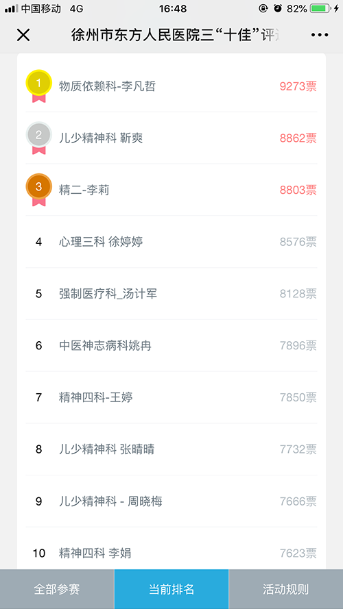 醫(yī)院高度重視三“十佳”評選活動,成立了評選委員會,制訂了評選活動方案與方法,并與5月16日召開動員大會,在醫(yī)院內(nèi)部進行宣傳發(fā)動,鼓勵廣大醫(yī)務(wù)人員積極參與評選。評選活動自2019年5月28日啟動,得到了全院職工積極響應(yīng),有48名醫(yī)生、84名護士、22名醫(yī)技人員積極參加了海選。參選人員熱情高漲,每位選手紛紛在微信朋友圈為自己或為同事投票。歷經(jīng)9天的活動,訪問量為161萬人次,投票人次達37萬,有效地通過多層面、多渠道、多角度宣傳醫(yī)院,讓更多人了解醫(yī)院、關(guān)心醫(yī)院、關(guān)注醫(yī)院,提高醫(yī)院社會知名度、影響力。按照活動方案規(guī)定,海選至2019年6月6日結(jié)束,兒少精神科王湛博等20名醫(yī)生、物質(zhì)依賴科李凡哲等20名護士、藥劑科盧海杰等20名醫(yī)技工作者入圍前20名。