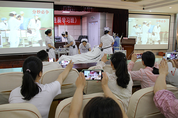 省市級(jí)繼續(xù)教育培訓(xùn)班上,來(lái)自骨科、呼吸科一病區(qū)、泌尿外科的醫(yī)學(xué)和護(hù)理學(xué)專家結(jié)合臨床常見、多發(fā)、高危病例的診斷、救治、護(hù)理、健教等主題集中講授、共同探討。“肺栓塞急救應(yīng)急演練”逼真再現(xiàn)驚心動(dòng)魄的日常救護(hù)場(chǎng)面,四位骨科護(hù)理人分秒必爭(zhēng),展現(xiàn)?凭C合急救實(shí)力,現(xiàn)場(chǎng)學(xué)員屏息凝神,用手機(jī)記錄下驚險(xiǎn)與重生的時(shí)刻。