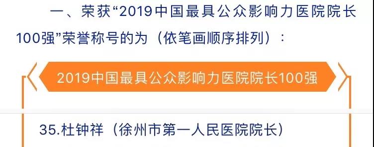 徐州市第一人民醫(yī)院院長杜鐘祥榮獲“2019中國最具公眾影響力醫(yī)院院長100強(qiáng)”榮譽(yù)稱號!