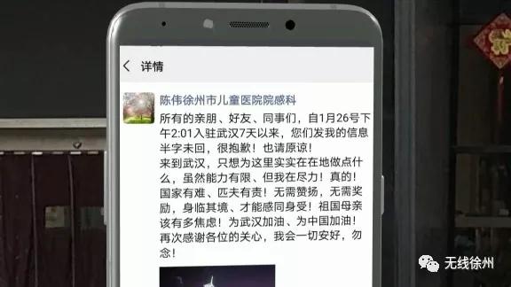 陳偉在微信里寫(xiě)到:“所有的親朋、好友、同事們,自到武漢7天來(lái),你們發(fā)的信息我只字未回,很抱歉!也請(qǐng)?jiān)?來(lái)到武漢只想為這里實(shí)實(shí)在在做點(diǎn)什么,我會(huì)一切安好,勿念。”