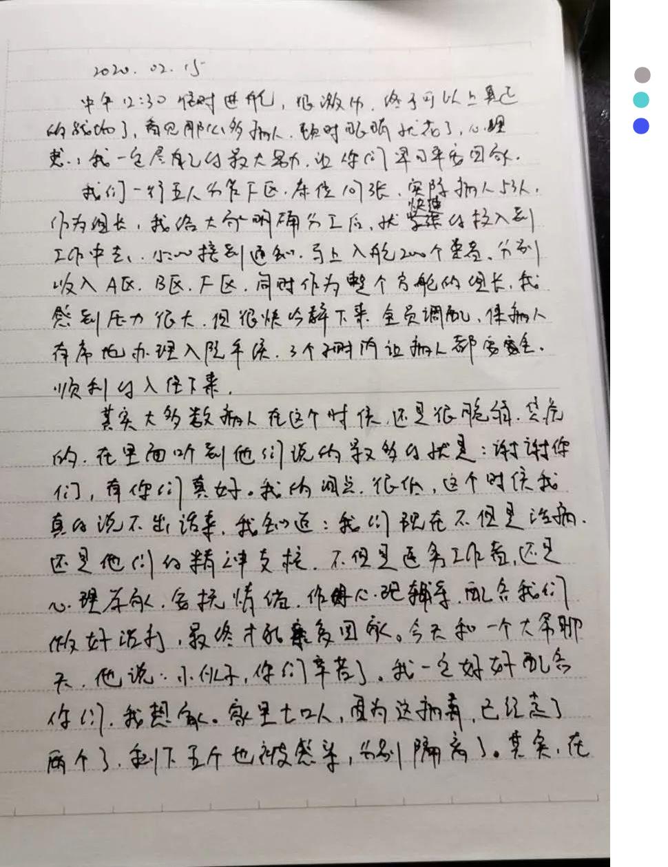 譚飛龍作為整個(gè)方艙和F區(qū)的組長(zhǎng),他與五名戰(zhàn)友共同守護(hù)53位患者,他在日記中寫道:“15:00時(shí)接到即將入艙200多名患者的通知,將吸入A、B、F區(qū),作為整個(gè)方艙的組長(zhǎng),我感到壓力很大……”憑借十年在急診科練就的處變不驚、臨危不亂的職業(yè)素養(yǎng),再加上三天的專業(yè)培訓(xùn),他很快冷靜了下來(lái),進(jìn)行全員調(diào)配,3個(gè)小時(shí)順利完成了這批患者的入住。