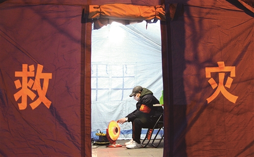 子夜,二環(huán)西路段南新村防疫點,一名居民志愿者在帳篷內取暖。