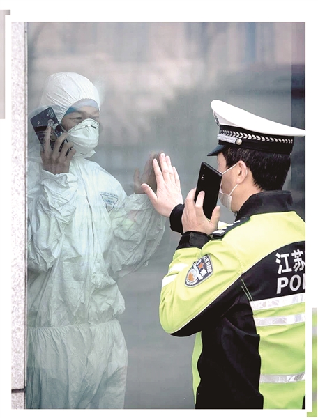 2月11日早晨上班前,徐醫(yī)附院感染性疾病科副主任護師王淑文和同樣奔波在戰(zhàn)“疫”一線的丈夫、市公安局開發(fā)區(qū)交警大隊民警王生坤,在徐醫(yī)附院隔離病房大樓隔著玻璃見上了一面。