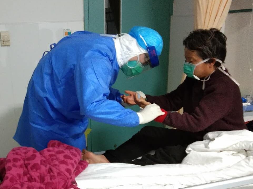 第二批“黨員突擊隊”投入正式工作的第一天,2月17日,就有8位新冠肺炎患者從隔離病房治愈出院,大家深受鼓舞。在隔離區(qū)工作要經過防護服、洗手衣、隔離衣、口罩、帽子、膠靴、手套等層層武裝,笨重而且不通氣,整天一身汗水,手腳浸泡形同枯木,臉上留下深深的勒痕,大家沒有人叫苦叫累。一方面,由于防護服成本較高,醫(yī)護人員都特別珍惜,為了最大程度節(jié)省防護物資;另一方面,也是避免穿脫防護服耽誤時間,每次穿上防護服進入隔離區(qū)七、八個小時里,都不能吃飯、喝水、上廁所,他們基本都是穿著成人尿不濕,連續(xù)工作。取咽拭子的工作是最危險的,患者嗆咳容易使氣溶膠飛濺,醫(yī)護人員卻要近距離面對患者,但是他們不僅沒有退縮,反而爭先恐后采樣;中醫(yī)科郝傳傳把扎實的中醫(yī)實踐用于新冠肺炎診治,挨個為病人把脈了解體制,辨證施治,迅速改善患者癥狀,縮短病毒轉陰時間;神經內科陳浩和黃炎針對患者緊張焦慮的情緒反復進行心理疏導,鼓勵患者放下包袱,樹立戰(zhàn)勝病毒的信心……